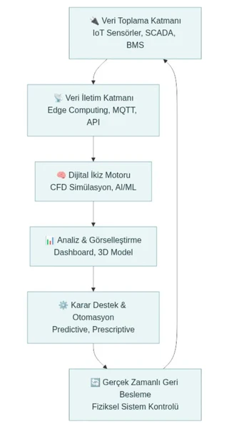 Bir dijital ikiz sistemi, birbiriyle entegre çalışan katmanlardan oluşmaktadır. Bu katmanlar, fiziksel dünyadan dijital dünyaya akan veriyi toplar, işler, analiz eder ve aksiyon üretir.