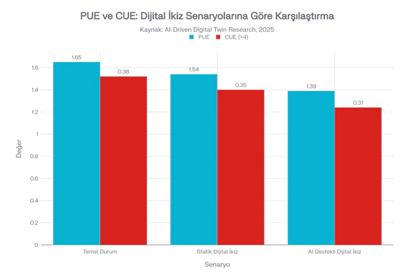 Bir akademik çalışma, AI destekli dijital ikizin veri merkezlerinde PUE değerini 1.65’ten 1.39’a düşürdüğünü göstermektedir. Bu iyileşme küçük görünse de, 0.1 PUE’lik bir düşüş bile yılda milyonlarca kWh tasarruf anlamına gelmektedir. Aynı çalışmada Karbon Kullanım Etkinliği (CUE) değeri 0.38’den 0.31’e düşmüş, termal tahmin doğruluğu (MAPE) %3,8 seviyesinde gerçekleşmiştir.