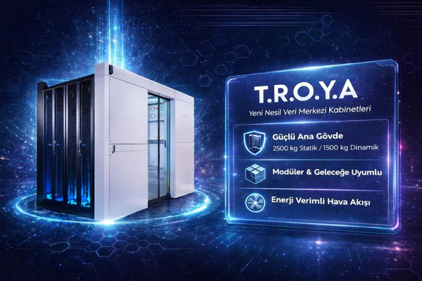 T.R.O.Y.A yeni nesil veri merkezi kabinet serimiz; 1,5–2 mm çelik gövdesi, 2000 kg’a kadar statik yük kapasitesi, %80 perfore kapı tasarımı ve ileri termal yönetimiyle yüksek yoğunluklu, enerji verimli altyapılar için ideal bir fiziksel zemin sunarken, entegre kablo yönetimi, güvenlik seçenekleri ve soğuk/sıcak koridor uyumluluğuyla dijital ikiz simülasyonlarının sahada bire bir karşılık bulmasını sağlar.